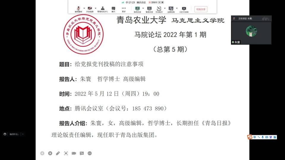 5月12日晚,青岛出版集团高级编辑朱寰博士应betway西汉姆联官方官网的邀请,以腾讯会议的形式做客betway西汉姆联官方官网论坛,为全体思政课教师做了题为《给党报党刊投稿的注意事项》的专题报告,betway西汉姆联官方官网经理贾乐芳教授主持论坛。朱寰,女,高级编辑,哲学博士,长期担任《青岛日报》理论版责任编辑,现任职于青岛出版集团。公司党总支书记修彩波教授以及全体教师参加了论坛。