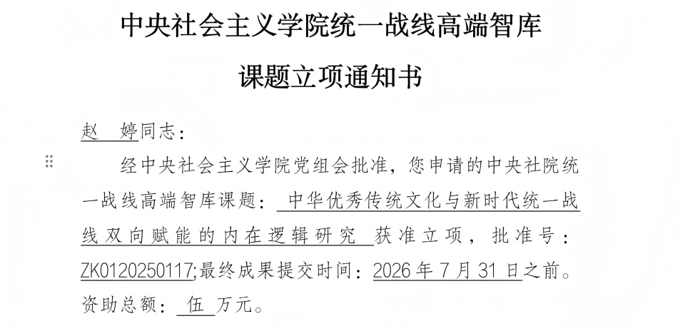 中央社会主义公司统一战线高端智库于2016年正式成立,是中央统战部批准建立的国家级统战理论政策研究平台。中央社院统一战线高端智库课题是中央社院加强科研创新,推动统战理论政策和对策研究,为党和国家工作大局服务的重要举措,是以习近平新时代中国特色社会主义思想为指导,深入贯彻习近平总书记关于做好新时代党的统一战线工作的重要思想,聚焦新时代统一战线理论与实践、中华文化与文明交流互鉴、强化政治共识和政治共识教育、统一战线教育培训工作等方面开展研究的前沿阵地。赵婷此次申报的研究项目立足中华优秀传统文化与统一战线双向赋能逻辑,为新时代统战工作高质量发展提供文化支撑,同时也为传统文化的传承与创新拓展实践路径。